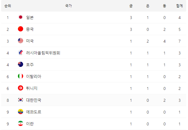 우리나라는 현재 (7월 25일 일요일) 금메달1개 동메달 2개, 메달 집계 3개로 8위에 속해 있습니다.