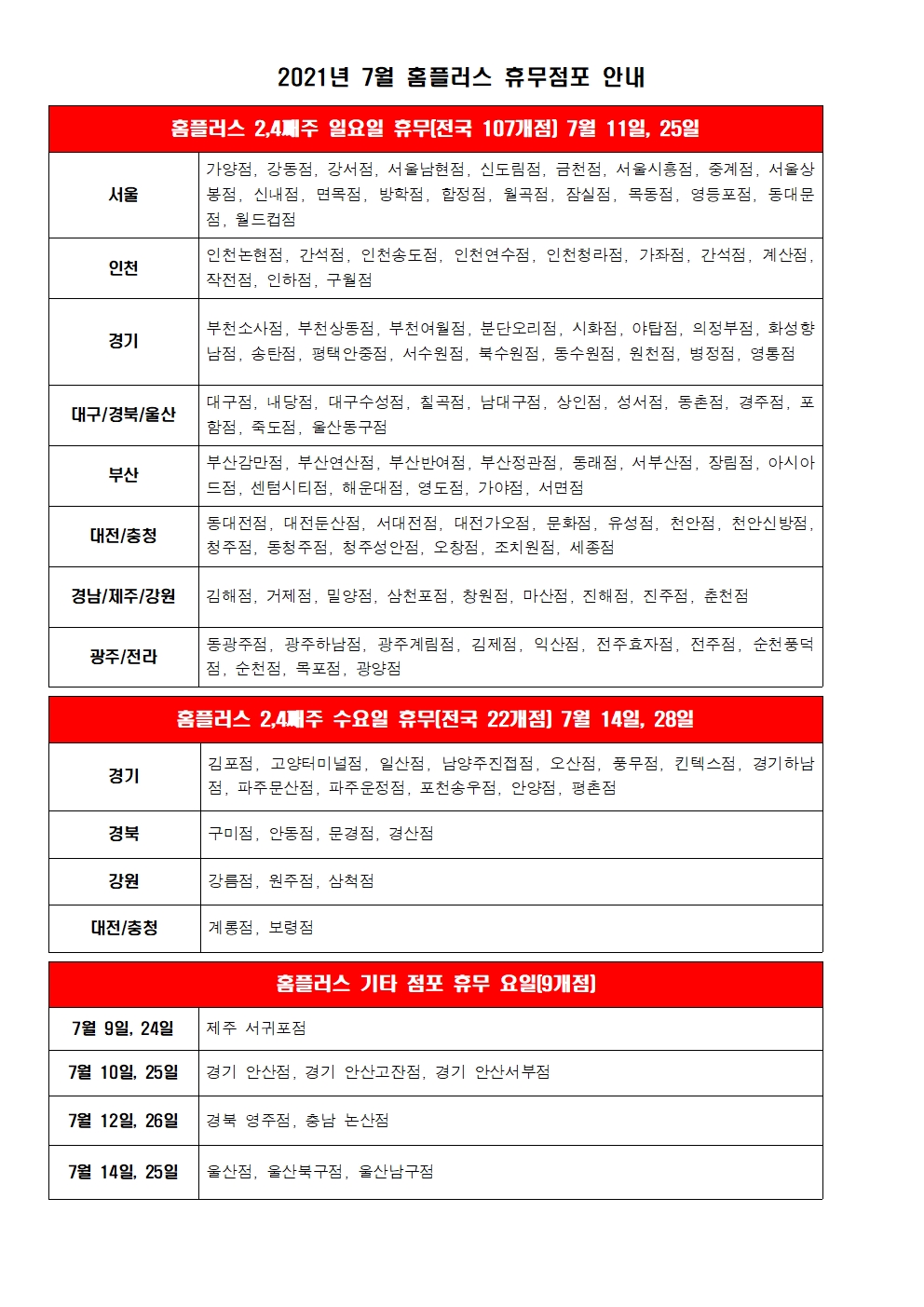 2021년 7월 홈플러스 휴무일에