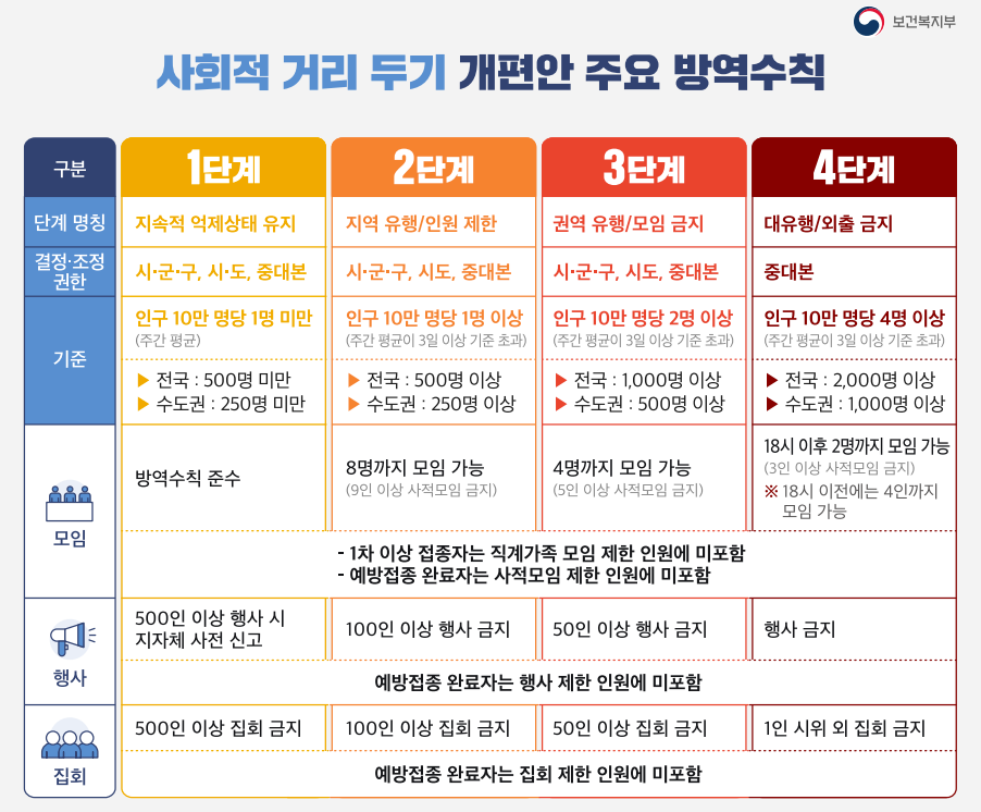 | 단계 명칭 | ▪ 지속적 억제상태 유지 | ▪ 지역 유행/인원 제한 | ▪ 권역 유행/모임 금지 | ▪ 대유행/외출 금지 |