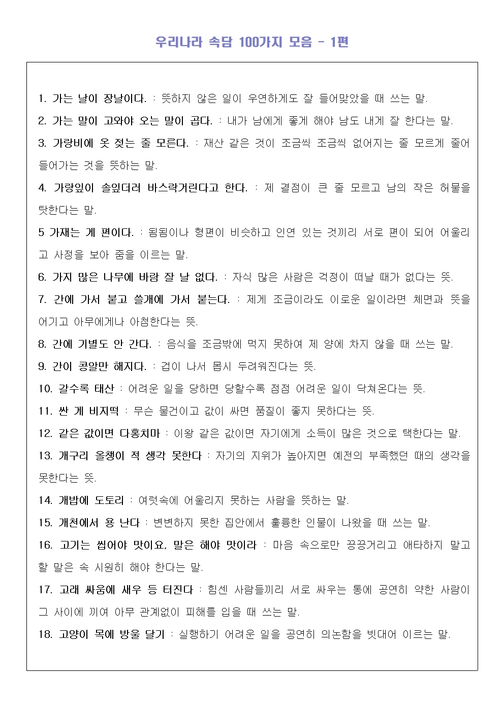우리나라 속담 100가지 모음을 가지고 왔습니다.