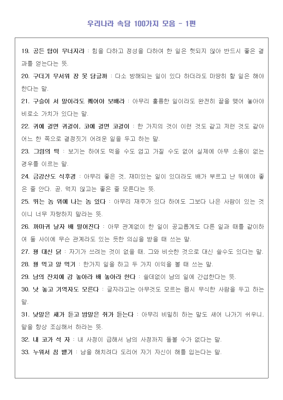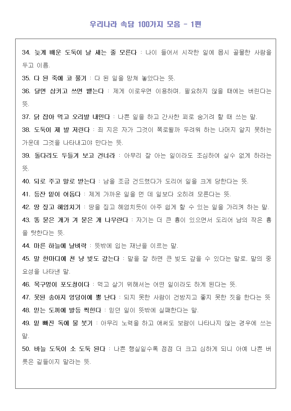 이렇게 우리나라 속담 100가지 중에 50가지를 살펴 보았어요.