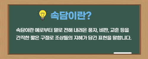 속담이란 예로부터 말로 전해 내려온 풍자, 비판, 교훈 등을 간직한 짧은 구절로 조상들의 지혜가 담긴 표현을 말합니다.
